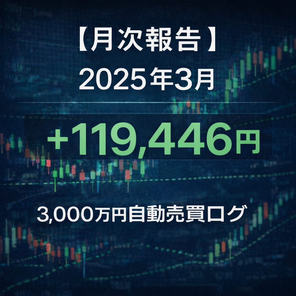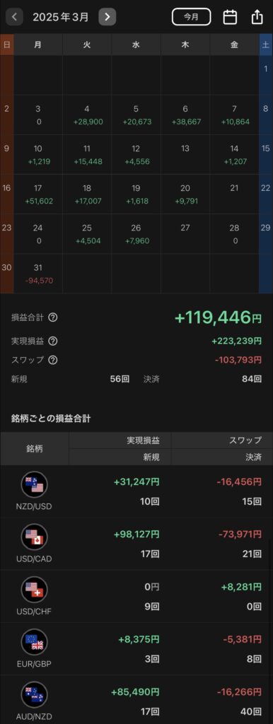 2025年3月のトライオートFXによる、自動売買の損益合計(実現損益+スワップ)は+119,446円でした