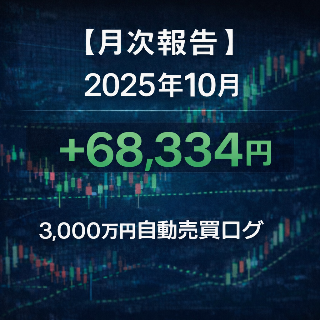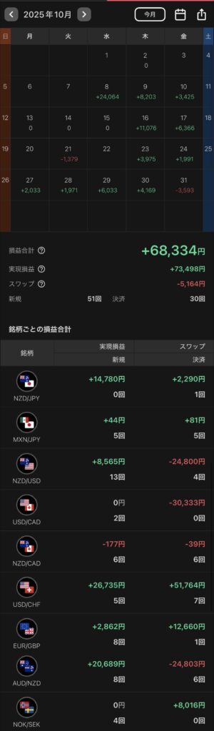 2025年10月のトライオートFXによる、自動売買の損益合計(実現損益+スワップ)は+68,334円でした