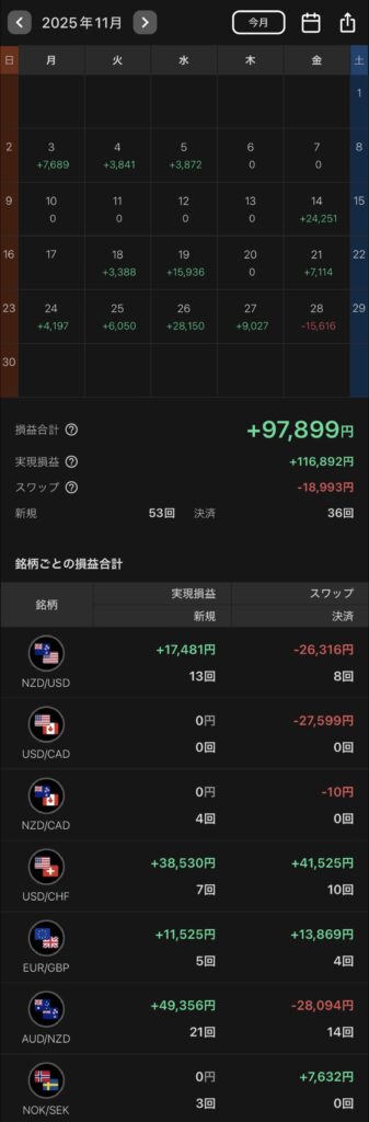 2025年11月のトライオートFXによる、自動売買の損益合計(実現損益+スワップ)は+97,899円でした