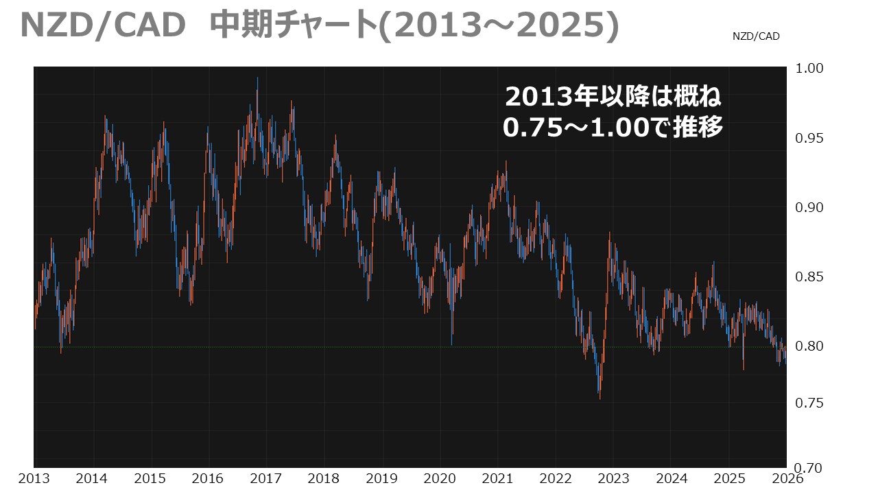 中期で見ると、NZD/CADは概ね 0.75〜1.00 の範囲で推移してきました。