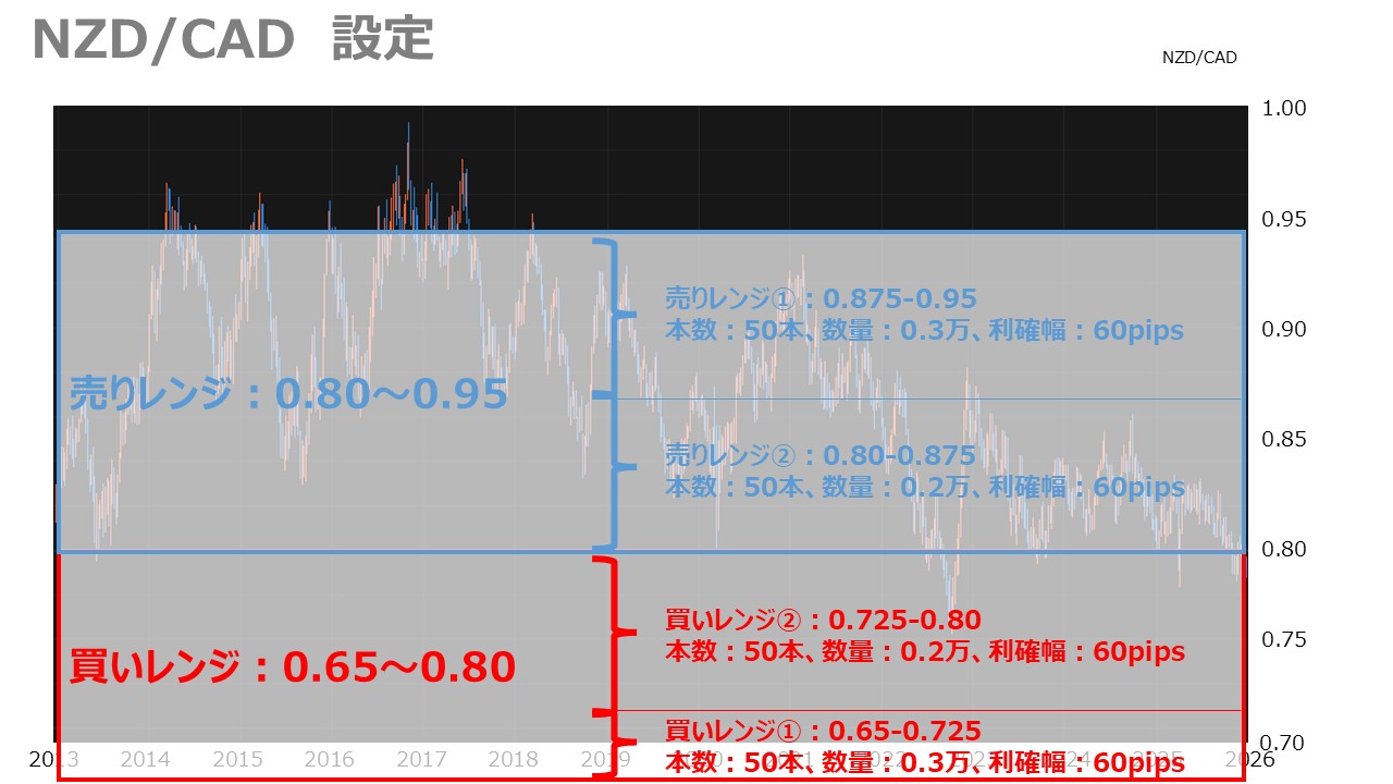 0.80を売り・買いの切り替えラインとし、上側はNZD高・CAD安に備えた売りレンジ、下側はNZD安・CAD高に備えた買いレンジとして使い分けています。