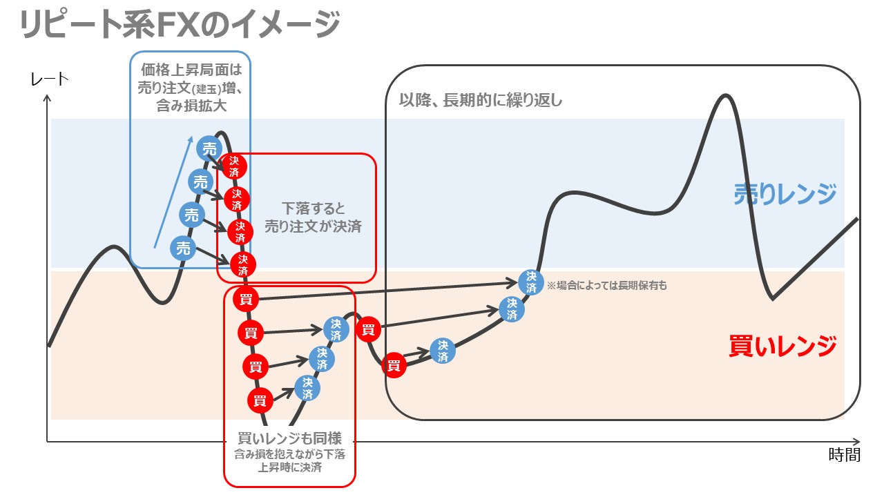 リピート系FXそのものの基本的な仕組みは「リピート系FXとは?を見る」で詳しく解説しています。