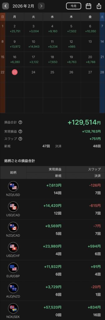 2026年2月第3週のトライオートFXによる、自動売買の実現損益は+129,514円でした