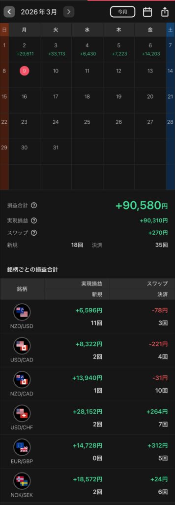 2026年3月第1週のトライオートFXによる、自動売買の実現損益は+90,580円でした