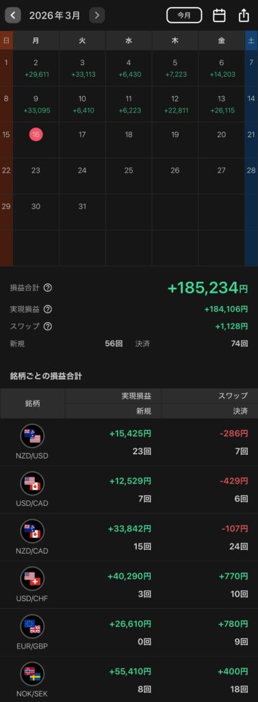 3月累計では+185,234円となり、月間20万円ペースに近い水準で推移しています。